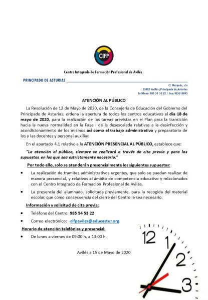 (Resolución de 1 de junio de 2020, de la Consejería de Educación, por la que se aprueba el calendario de actuaciones y se concretan otros aspectos del procedimiento de admisión del alumnado en centros docentes no universitarios públicos y privados concertados del Principado de Asturias, para cursar ciclos formativos de grado medio y de grado superior en régimen presencial en el año académico 2020-2021)